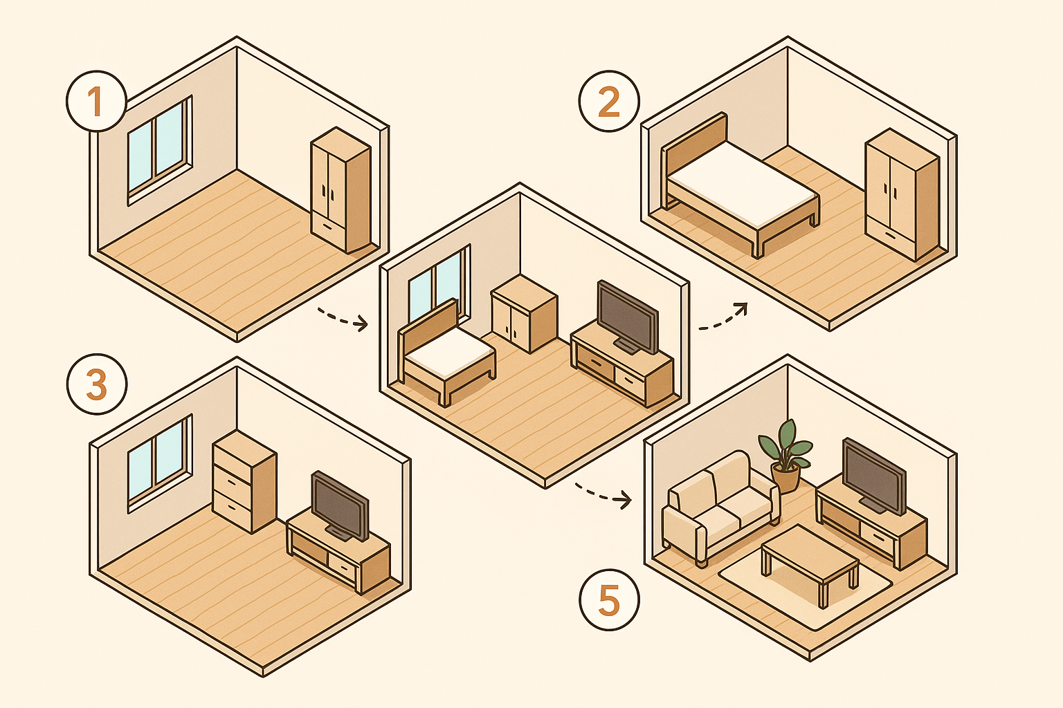 - 큰 공사(바닥·벽) → 가구 배치 → 소품 정리 순서로 진행